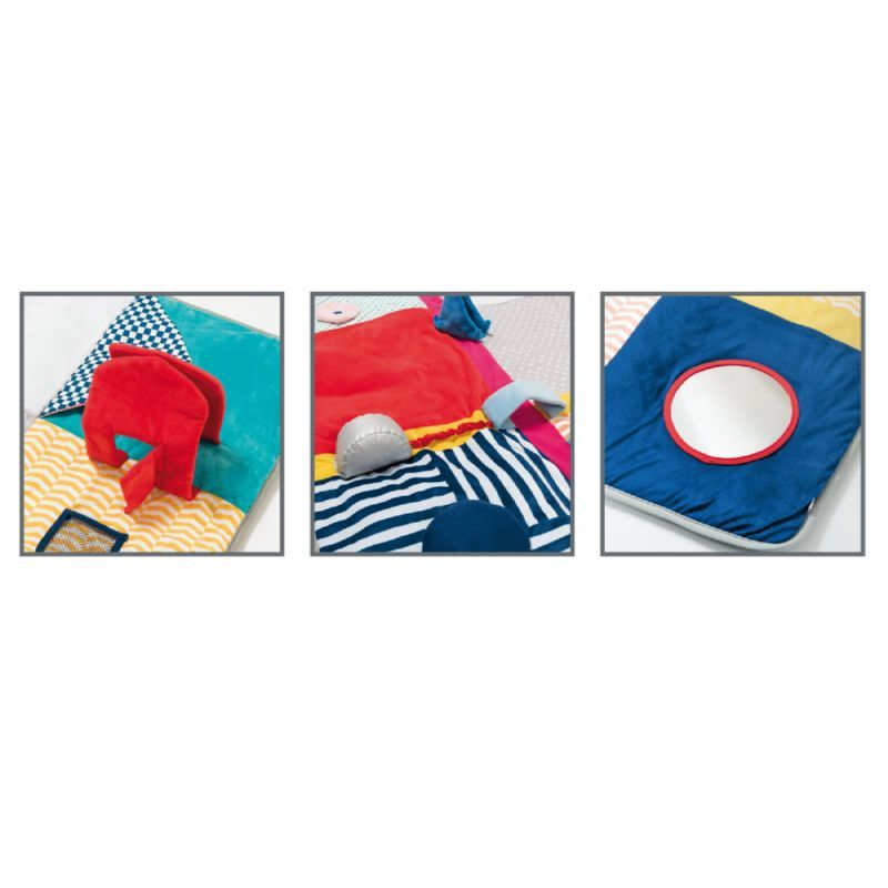 | Extra Χαρακτηριστικά | Διαφορετικές αισθήσεις και αντιθέσεις: αφή βελούδου, αφή βαμβακιού, 15 δραστηριότητες. 5 αξεσουάρ που δεν είναι ραμμένα στο χαλάκι: 1 μπάλα με σφυρίχτρα, 1 κύλινδρος με χαρτί φρουασέ, 1 κύβος με χαρτί φρουασέ,, 1 πυραμίδα από χαρτί φρουασέ, 1 σπίτι, 1 καθρέφτης, 1 όχημα με συσκευή δονήσεων που έλκεται, 1 μικρή θήκη, 2 λουλούδια και 2 ημικυκλικά τεμάχια από χαρτί φρουασέ, 2 τριγωνικά πλαίσια με αντιθέσεις, 1 γέφυρα, 1 σήραγγα, 1 δίσκος από μαλακό βελούδο. |