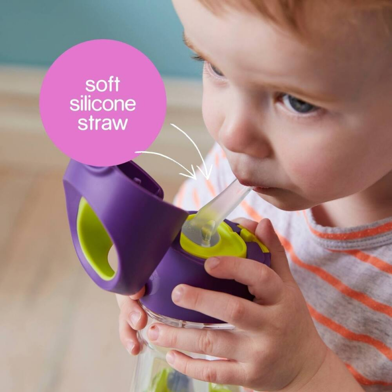 - Καλαμάκι από σιλικόνη και καλαμάκι υπό γωνία επιτρέπει στα παιδιά να πίνουν ακόμα κι όταν το γέρνουν.