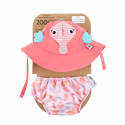 Το σετ περιλαμβάνει επαναχρησιμοποιούμενη πάνα - μαγιό και καπέλο, που παρέχουν προστασία από τις βλαβερές ακτίνες του ήλιου.