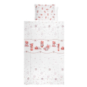 Πάπλωμα διαστάσεων 95 x 140 εκ Σεντόνι διαστάσεων 100 x 150 εκ Μαξιλάρι διαστάσεων 35 x 43 εκ Μαξιλαροθήκη διαστάσεων 35 x 43 εκ Πάντα που καλύπτει όλη την κούνια, με διαστάσεις 2 x (26 x 70) και 2 x (26 x 140) εκΤα υλικά είναι 100% βαμβάκι και υποαλλεργικά, κατάλληλα για βρέφη. Όλα τα υφάσματα πλένονται στο πλυντήριο.