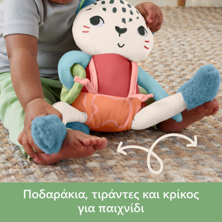 Εμπνευσμένο από ζώα που προβάλλονται από το Παγκόσμιο Ταμείο Άγριας Ζωής, το αισθητηριακό παιχνίδι Planet Friends Spotting Fun Snow Leopard από τη Fisher-Price® χρησιμοποιεί ύφασμα κατασκευασμένο κατά 95% από ανακυκλωμένο πλαστικό μετά την κατανάλωση και διατίθεται σε συσκευασία πιστοποιημένη από FSC για την υποστήριξη της υπεύθυνης δασοκομίας. Αυτό το βελούδινο παιχνίδι διαθέτει σατινέ υφάσματα, απαλές τσαλακωμένες μπότες και χρώματα υψηλής αντίθεσης που προκαλούν τις αισθήσεις του μωρού σας. Οι διασκεδαστικές λεπτές κινητικές δραστηριότητες περιλαμβάνουν πόδια έλξης, ανάρτηση και μαλακό συρόμενο δαχτυλίδι βραχίονα για να ανακαλύψει το μικρό σας. Αυτό το παιχνίδι μπορεί επίσης να προσφέρει μια αίσθηση ασφάλειας για το μωρό σας στο σπίτι ή όταν ταξιδεύετε και πλένεται στο πλυντήριο.